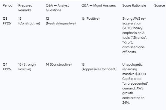 Sentiment Shift: Tone shifted from “optimistic re-acceleration” in Q3 to “aggressive AI dominance” in Q4, characterized by the massive capital commitment to capture the AI infrastructure layer.
