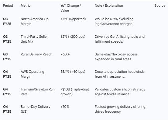 Retail Efficiency & Speed: Delivery speeds hit records in both quarters; regionalization and robotics are driving cost-to-serve improvements, though Q1 FY26 faces a ~$1 billion cost headwind from the “Amazon Leo” satellite program.