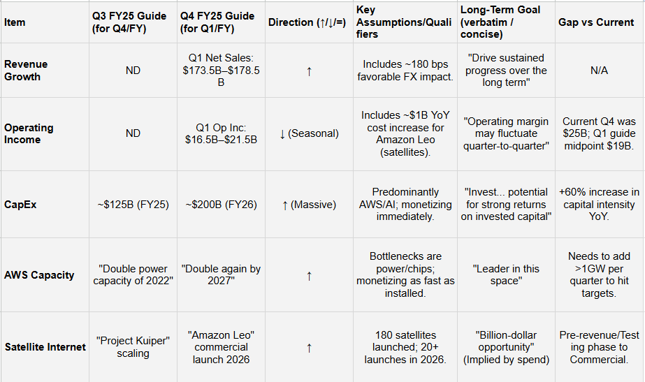 AI Capex Surge: Management guided to ~$200 billion in CapEx for 2026, a massive increase from ~$125 billion in 2025, predominantly allocated to AWS and AI infrastructure. This was ~60% above consensus expectations for FY26.