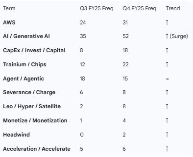 TF/IDF Narrative: The term “CapEx” and “200 billion” dominates the uniqueness of the Q4 transcript compared to Q3. “Trainium” and “Chips” also see a marked increase in weighted importance, signaling the shift from software/services (Agents) in Q3 to hard infrastructure in Q4. The emergence of “Leo” (Satellites) as a specific cost center is a new distinct topic.