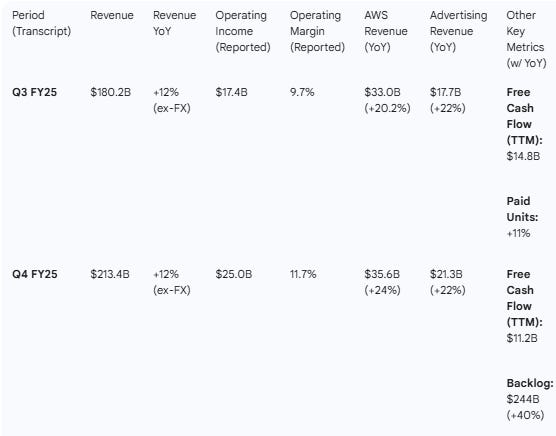 Backlog Growth: AWS backlog grew 40% YoY to $244 billion in Q4, signaling long-term durability in the cloud re-acceleration.