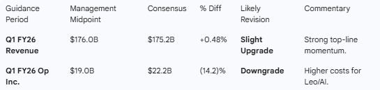 Guidance Implications: Expect revenue upgrades but operating margin downgrades. Management’s Q1 operating income guidance midpoint of $19B sits a hefty ~14% below market expectations as the company front-loads investment.