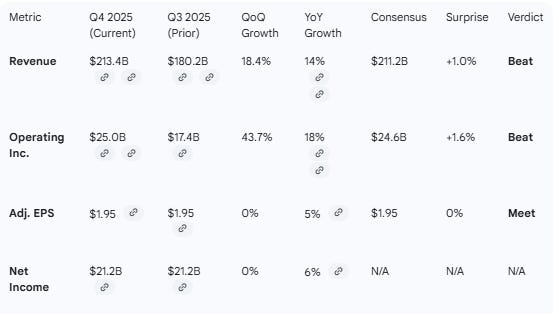 Result: Beat consensus on revenue ($213.4B vs $211.2B) and small Beat on operating income ($25.0B vs $24.6B).