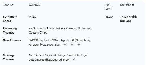 Management Commentary: Management shifted from a defensive posture in Q3 (addressing legal charges) to an aggressive offensive in Q4. The key message is that Amazon is now an “AI-first” company, intending to spend $200B in 2026 to build the world’s leading AI and satellite infrastructure.