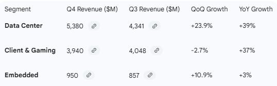 (Note: “Client & Gaming” are combined in Q4 presentation tables, though broken out in text: Client $3.1B, Gaming $843M )