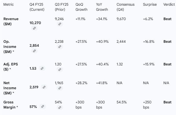 Implied Growth: The Q1 revenue guide of $9.8B implies 32% YoY growth, roughly maintaining the high-growth pace set in Q4 (+34%)
