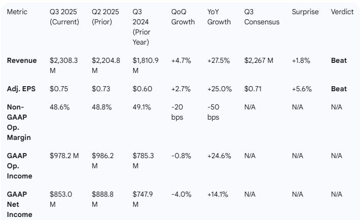 Result: Mixed. Arista reported a solid Q3 beat on revenue (1.8%) and adjusted EPS (5.6%). However, this beat was completely overshadowed by a weak Q4 2025 guidance.