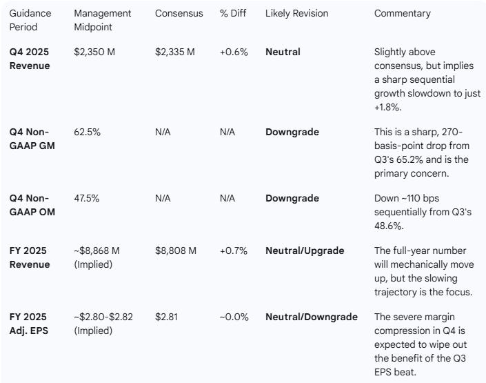 Implied FY25 Adj. EPS: The significant drop in guided margins (both gross and operating) will likely cancel out the revenue beat, leaving implied EPS in line with or slightly below the $2.81 consensus, despite the Q3 beat.