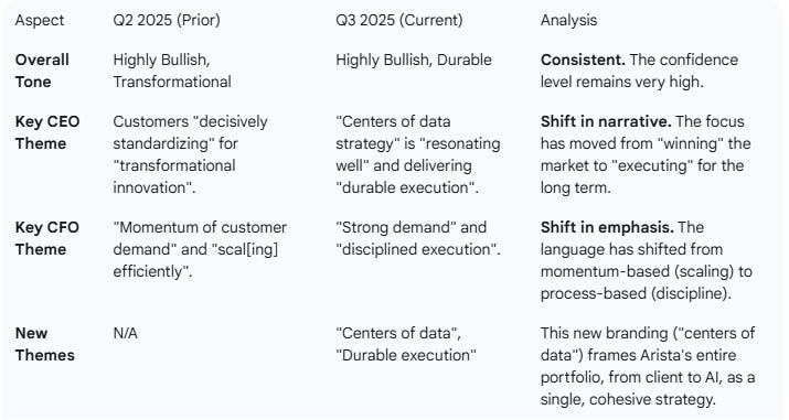 In Q2, the tone was more focused on market capture and financial milestones. CEO Ullal stated customers were “decisively standardizing” on Arista’s platform for “transformational innovation”. The key qualitative highlight was Arista’s position in “data-driven AI networking”. CFO Breithaupt celebrated Non-GAAP operating income crossing $1 billion for the first time, highlighting the “strength of our business model” and “momentum of customer demand”.