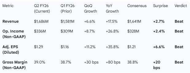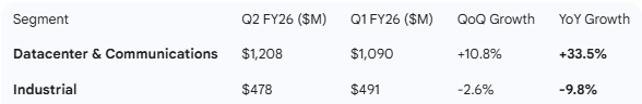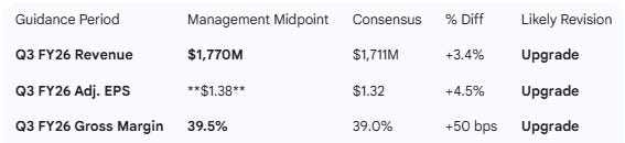 Analyst Impact: Given that the Q3 guidance midpoint is ~4% above consensus for both revenue and earnings, and the Industrial segment is cited as “improving,” analysts are likely to raise their full-year FY26 and FY27 estimates. The implied YoY “reported” revenue growth for Q3 is ~18% (based on $1.77B midpoint vs $1.498B in Q3 FY25), showing sustained momentum compared to Q1 and Q2.