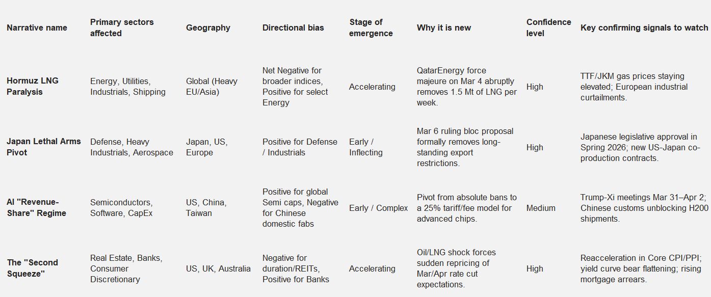 The Central Bank “Second Squeeze”: The immediate inflationary pass-through from the Hormuz closure has shattered Q1 rate-cut pricing. Broker notes across the UK, US, and Australia are suddenly discussing the possibility of a “second squeeze” (and even rate hikes), dramatically altering the outlook for real estate, banks, and long-duration equities.