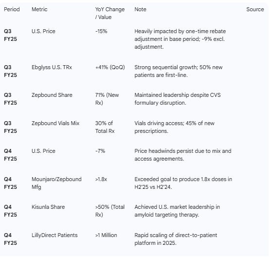 Growth Drivers: FY26 guide implies 25% growth. Zepbound vials now 1/3 of total prescriptions. Kisunla claimed >50% market share in Alzheimer’s.