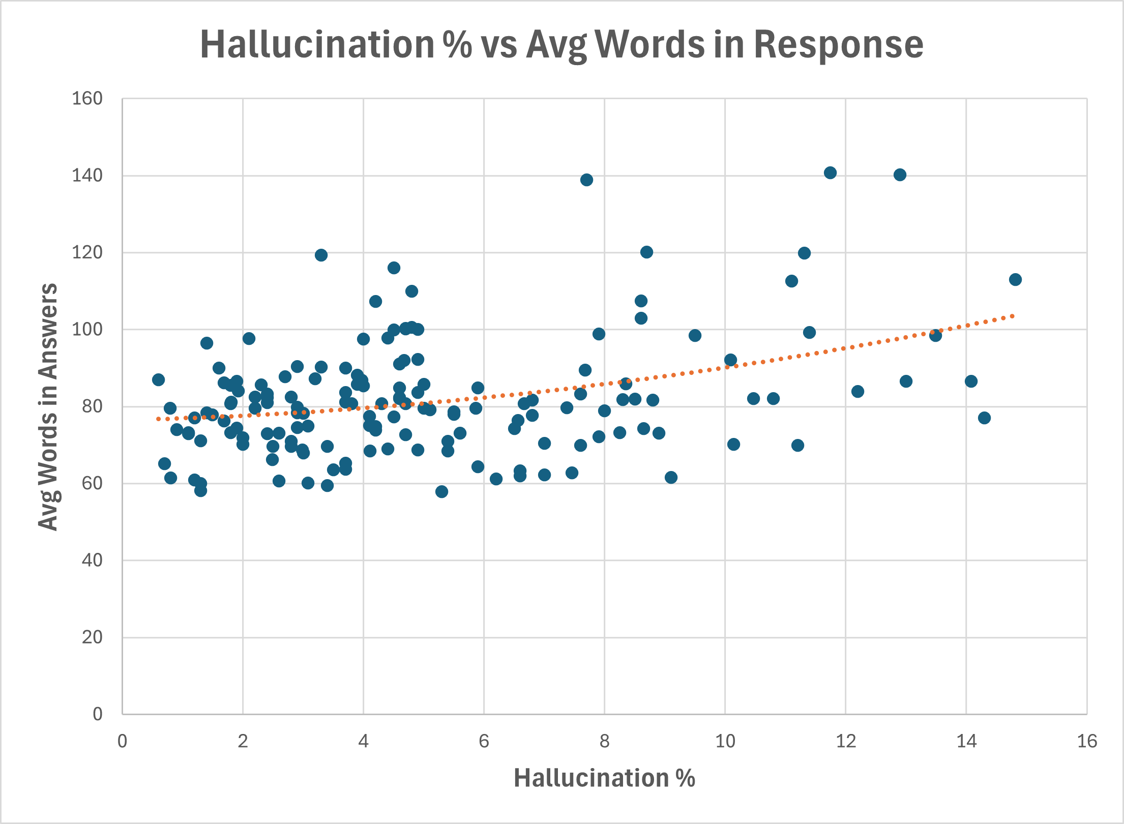 Answer length does increase hallucinations. Some studies report that constraining models to a simple yes/no answer can get accuracy to 100%. The “wordier” the models, the more they hallucinate. The following chart shows this from the HHEM data. Each dot represents a different model comparing their average words in a news summary response to their hallucination propensity: