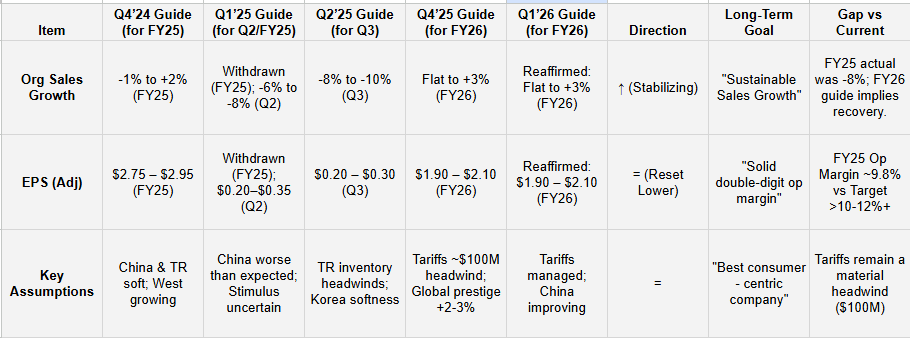 China & Travel Retail Stabilization: The “Asia Travel Retail” (TR) overhang dominated FY24 and FY25. By Q1 FY26, TR inventory was deemed “rightsized” 4, and China returned to growth, acting as a tailwind rather than a headwind for the first time in several quarters5.