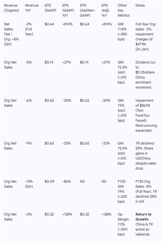 From Trough to Recovery: The period spans a significant operational trough in FY25, characterized by guidance withdrawals, dividend cuts, and impairments, followed by a pivot to growth in Q1 FY26. The narrative shifts from “managing decline” (inventory destocking in China/Travel Retail) to “igniting growth” under the Beauty Reimagined strategy.