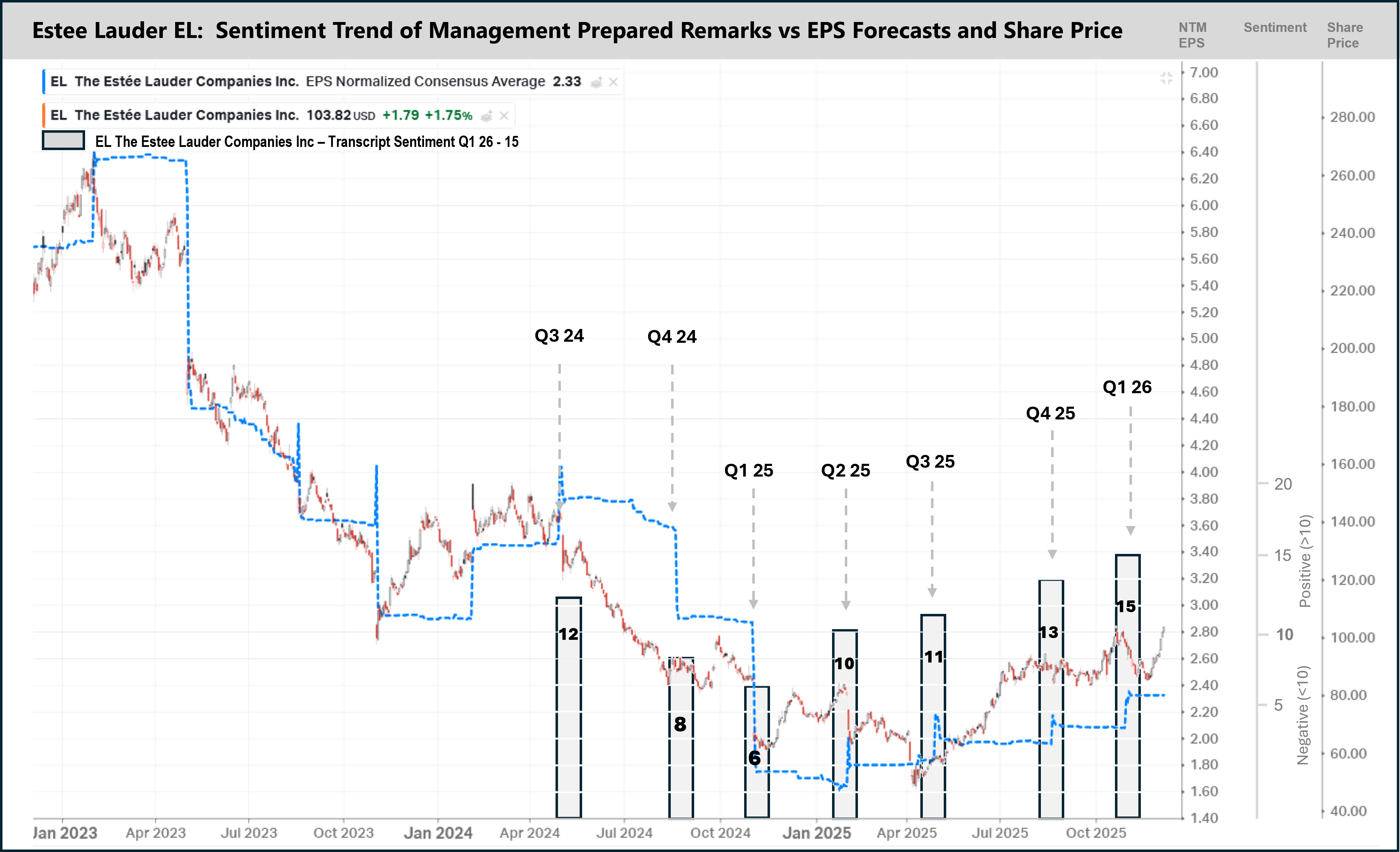 The following chart shows the share price of EL (red/green bars) correlated with next twelve months (NTM) EPS forecasts from analysts (dotted blue line). I have added in a column chart of sentiment scores based on management prepared remarks from the last 7 quarterly earnings call transcripts (refer the transcript analysis in appendix).