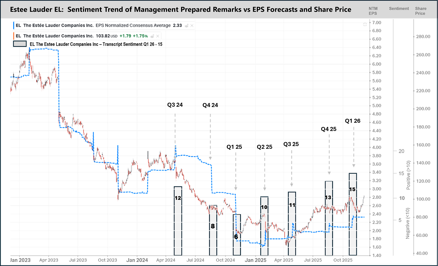Fantastic deep dive into the signal-to-noise challeng in earnings analysis. The Estee Lauder case perfectly illustrates how management language telegraphs operational inflection points months before they appear in the numbers. Your identification of sentiment divergence during the tariff scare is especially compelling; markets often misread surface-level macro headwinds when underlying busines fundamentals are actually strengthening. This type of qualitative-led analysis used to require years of sector expertise but now AI democratizes it remarkably.