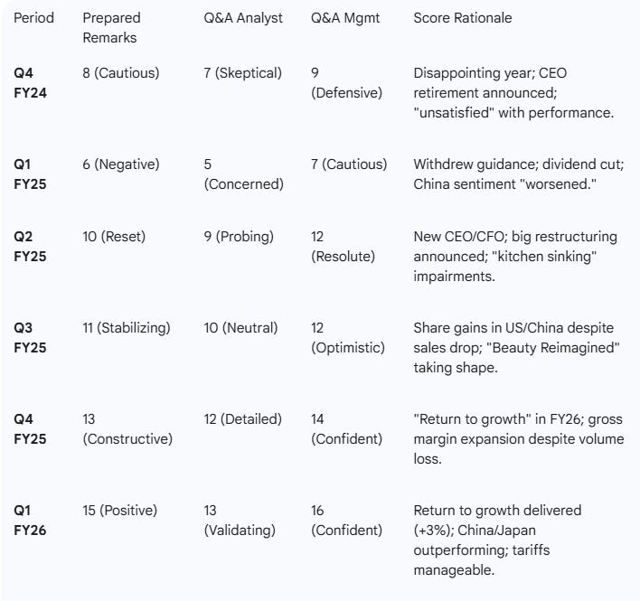 By February 2025 (Q2), the narrative began to shift. With new CEO Stéphane de la Faverie at the helm, the company launched its “Beauty Reimagined” strategy. While the numbers were still in transition, the sentiment score rebounded from contraction (<10) to a “Neutral” (10/20). Management replaced passive language about “headwinds” with active verbs like accelerate, execute, and transform. This sharp improvement in sentiment tone, despite lackluster financials, was the first green shoot of a potential structural turnaround. Analysts in Q&A (see appendix), while more constructive, were still on balance negative (sentiment of 9). This was a vast improvement on a score of 5 in the prior quarter but is a score that is “less negative” rather than moving to constructive. I consider this a “cleaning” signal. With management neutral and analysts still negative, the probability that the share price will rally considerably is low in a turnaround situation.