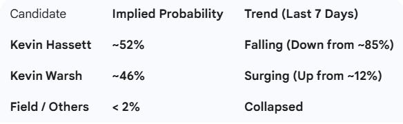 Trump’s “Two Kevins” Comment: In his Friday interview with the Wall Street Journal, President Trump explicitly named them as the finalists: “I think the two Kevins are great... I have a pretty good idea who I want.” This confirmed Warsh was real competition for Hassett, triggering a massive repricing in the betting markets.