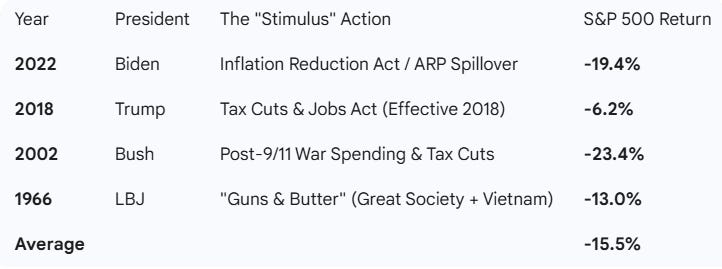 The best midterm year in modern history, 1954 (+45%), was driven by a collapse in government spending following the Korean War, which killed inflation and allowed the Fed to keep rates low. Conversely, years like 1966 (-13%) and 2018 (-6%) and 2022 (-19%) shared a common flaw: the administration stimulated the economy when it was already hot or experiencing inflation. This “Stimulus Paradox” forced the Fed to hike rates to counteract government spending, crushing equity valuations.