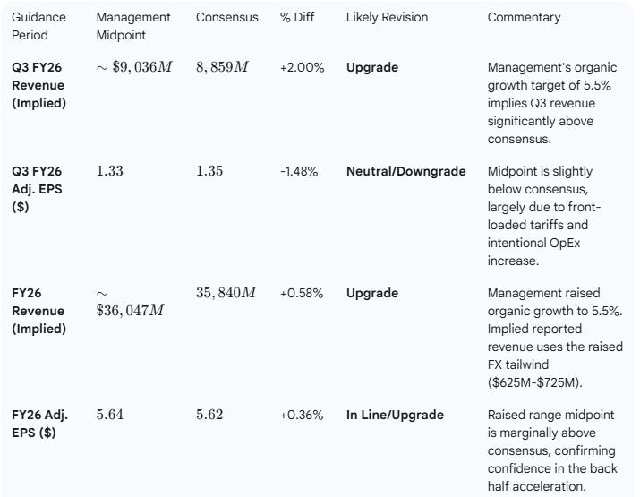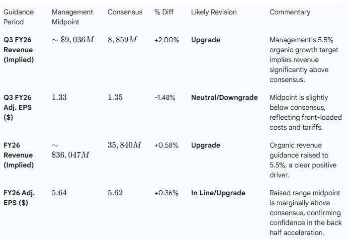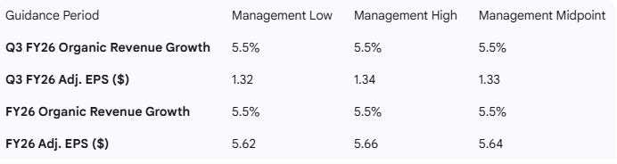 Guidance: Raised FY26 Organic Revenue growth to 5.5% (from 5.0%) and raised the FY26 Adj. EPS range to $5.62 to $5.66 (from $5.60 to $5.66).