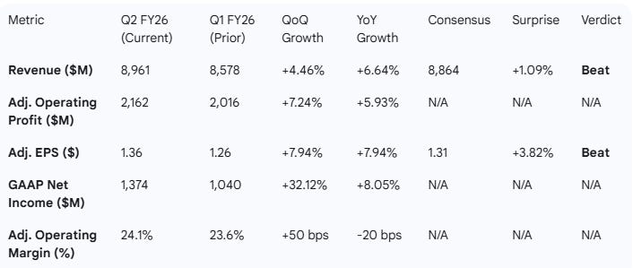Note: Q2 FY25 Revenue was $8,403M, Q1 FY25 Revenue was $8,004M. Q2 FY25 Adj. Operating Profit was $2,041M, Q1 FY25 Adj. Operating Profit was $1,953M. Q2 FY25 Adj. EPS was $1.26, Q1 FY25 Adj. EPS was $1.23. Q2 FY25 GAAP Net Income was $1,271M (calculated from GAAP EPS of $1.07 * 1287.1M shares, not explicitly provided as $M) Q1 FY25 GAAP Net Income was $1,278M. Net Income Y/Y and QoQ growth are calculated using the stated GAAP Net Income for Q2 FY26 ($1,374M) and Q1 FY26 ($1,040M) compared to the prior year/quarter’s value in the table.