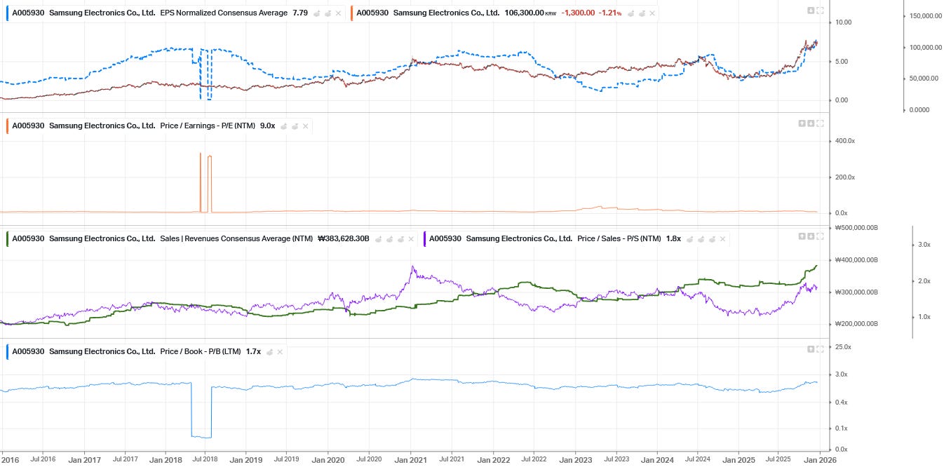 Samsung Electronics (P/Sales, P/E, P/Book multiple trends last 10 years)