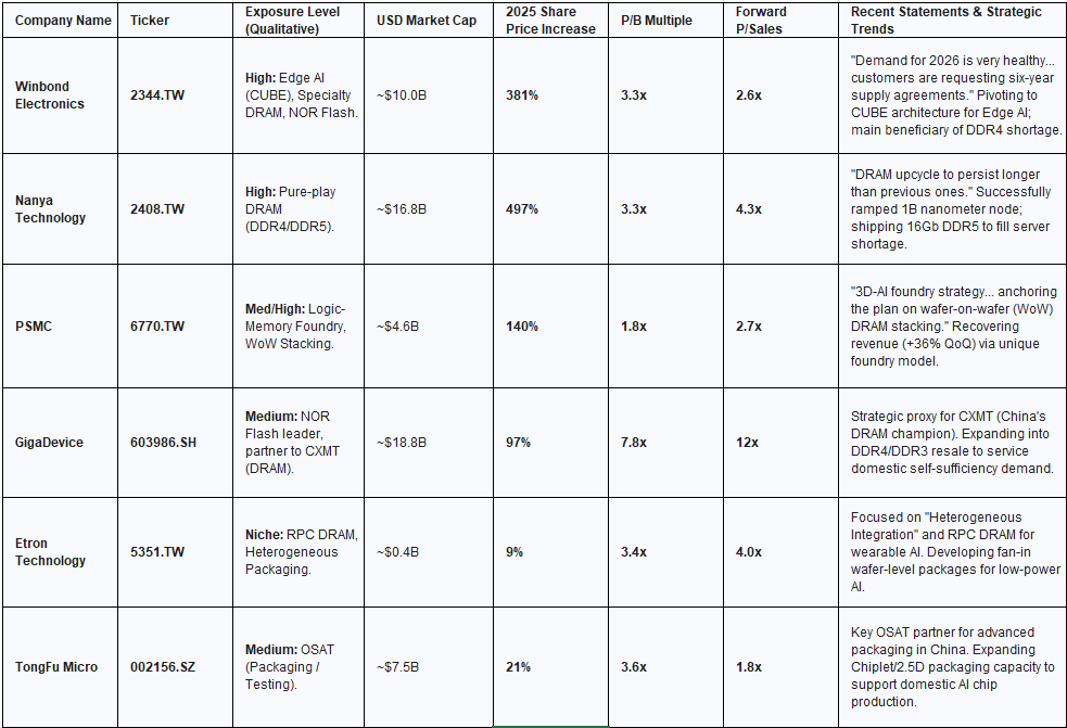 Winbond Electronics is an “Edge AI” play, with a unique technology (CUBE) that solves a critical physical problem for the next generation of devices. Nanya Technology offers the purest exposure to the structural supply deficit in commodity DRAM, serving as the “supplier of last resort” for the world’s servers but requires the market to embrace a “longer cycle” mentality to justify further P/B multiple expansion, which may be challenged by eyes being on the China capacity build out. PSMC and GigaDevice offer specialized, albeit riskier, avenues for growth through foundry innovation and geopolitical positioning, respectively. Etron, is a small niche (and speculative) operator which could benefit if AI wearables really catch on (OpenAI’s AI device plans being something to watch out for).
