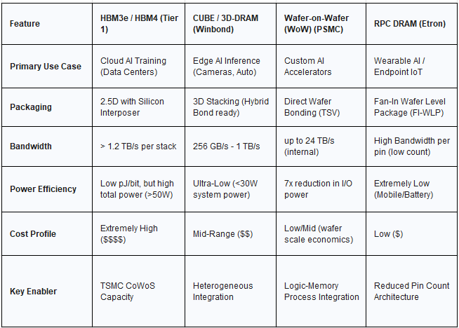 The Opportunity: There is a “missing middle” in the memory hierarchy—applications that need more bandwidth than LPDDR5X can provide (roughly 8.5 Gbps/pin) but cannot afford the power or dollar cost of HBM. This is the precise beachhead that companies like Winbond (with CUBE) and PSMC (with WoW) are attacking. They are creating “AI-customized” memory that offers high bandwidth (256GB/s to 1TB/s) within a consumer power envelope (<30W).