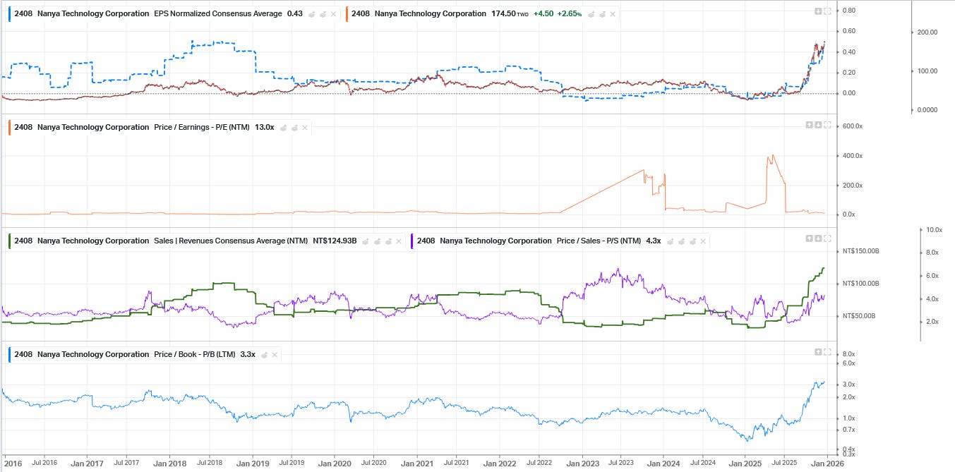Nanya @ 3.3x P/B: Nanya’s valuation (same P/B, higher P/Sales) reflects an ongoing turnaround with earnings rebounding from more depressed levels. It is priced now for peak earnings and must prove that. Q3 results showed a much needed profit inflection. The upside here is potentially questionable given a 500% rally in 2025. Etron’s Chairman has specifically warned about the magnitude of new China DRAM capacity additions. The market sees higher earnings growth ahead for Nanya than Winbond with operating margins growing into the 40-50% range in 2026 and higher revenue growth due to the stock’s more pure DRAM exposure. This comes at the expense of future risk from China capacity in this segment.