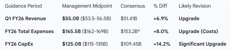The Q1 revenue guidance midpoint of $55.0B implies ~30% YoY growth (vs. Q1’25 $42.3B), representing a significant acceleration from the 24% growth achieved in Q4 and well above market expectations. However, the $125B CapEx midpoint and total FY26 expense guidance are also shocks to the upside and larger in magnitude than the revenue upside.