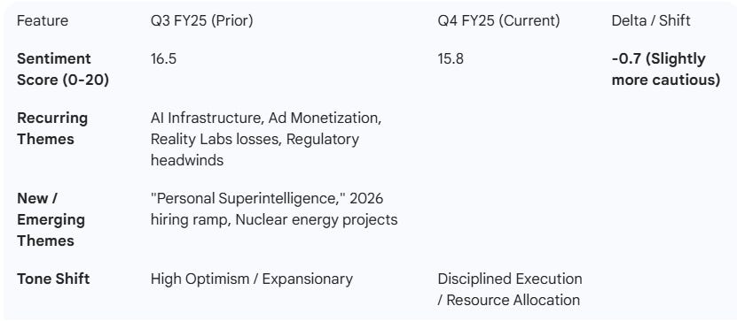 Prior Quarter (Q3 FY25): Management emphasized the successful launch of “Meta Superintelligence Labs” and leadership in AI glasses. The tone was celebratory regarding community growth but carried a stern warning that infrastructure needs were expanding “meaningfully” beyond previous expectations, signaling the start of the current high-CapEx cycle.
