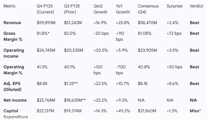 *Gross Margin calculated as (Revenue - Cost of Revenue) / Revenue. Q4 Cost of Revenue: $10,905M. **Q3 figures are adjusted to exclude the $15.93B one-time tax charge for comparability. ***CapEx “miss” in this context refers to spending exceeding the consensus estimate, reflecting higher-than-expected investment.