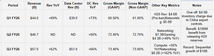 Growth Acceleration: Revenue growth remains hyper-expansive, accelerating from $44 billion in Q1 (+69% YoY) to $57 billion in Q3 (+62% YoY), consistently beating guidance. Data Center revenue continues to drive the topline, growing 66% YoY in Q3.