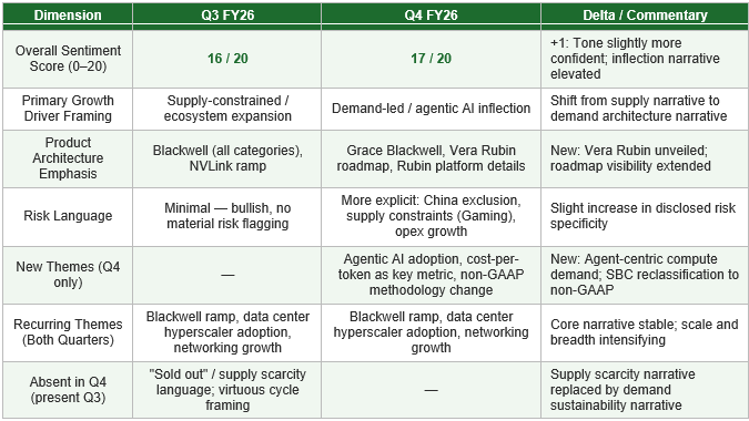 Compared to Q3 FY26, management’s tone in Q4 FY26 became marginally more measured on supply dynamics while escalating confidence in demand durability — shifting from a supply-constrained framing to an AI-infrastructure investment cycle narrative. The introduction of agentic AI as a primary demand catalyst represents a new thematic dimension not present in Q3. The explicit disclosure of zero China Data Center revenue assumptions in Q1 guidance, and supply headwinds flagged for Gaming, represent a modest but notable increase in risk transparency versus the near-universally bullish Q3 narrative.