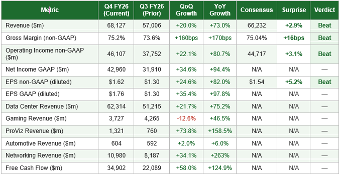 NVIDIA delivered record quarterly revenue of $68.1 billion in Q4 FY26, representing 20.0% sequential and 73.0% year-over-year growth. Results exceeded consensus expectations across all key financial metrics, with non-GAAP EPS of $1.62 beating the $1.54 consensus estimate by approximately 5.2%. The quarter demonstrated accelerating gross margin expansion, with non-GAAP gross margin of 75.2% exceeding both consensus and prior quarter levels as the Blackwell architecture continued to ramp with an improved cost structure.