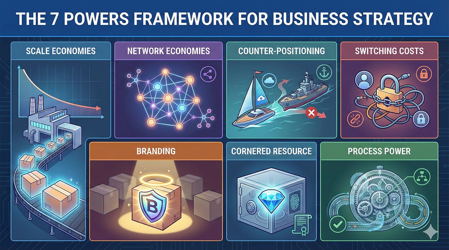 Hamilton Helmer’s 7 Powers framework is a strategic tool used to identify the structural competitive advantages that allow a business to generate persistent differential returns. These powers include Scale Economies, where unit costs decline with volume; Network Economies, where the value of a service increases for all users as more join; Switching Costs, which lock customers in due to the expense or effort of changing suppliers; and Counter-Positioning, where a new business model is adopted that incumbents cannot mimic without damaging their existing business.