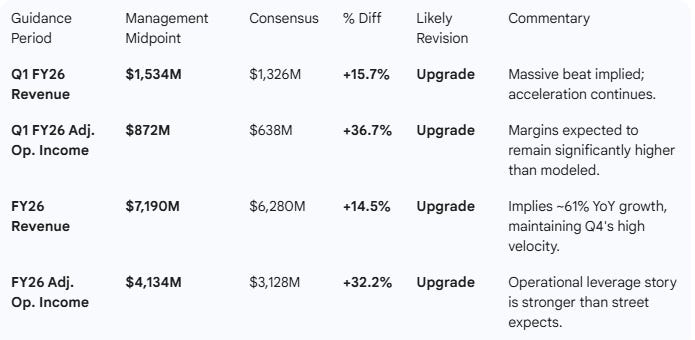 Guidance for FY26 is a “shock and awe” print. Revenue guidance of ~$7.19B is 14.5% above consensus, and operating income guidance is 32% above consensus. This ensures a wave of upward analyst revisions.