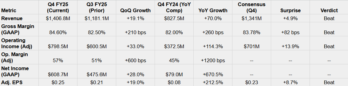 Result: Significant Beat. Palantir crushed consensus on both top and bottom lines. Revenue of $1.41B (+70% YoY) beat the $1.34B target, and Adjusted EPS of $0.25 beat the $0.23 target.