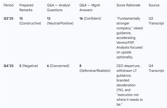 Back in November ‘25, I wrote a detailed post examining what was happening to the PYPL share price. After an upbeat Q3 result and call which saw the stock rally 10%, it fell 23% over the following 3 weeks. This seemed at odds with management’s statements at the Q3 result and aligned with the timing of PYPL’s likely post results roadshow where clearly insto’s were hearing a far more negative story than managements speech at Q3. So I undertook to find out what was going on. I was not a holder of PYPL at the time but it was on my turnaround watchlist.