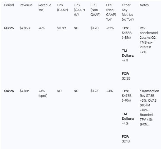 The Q4 result falls significantly short of expectations. While EPS grew 3%, the core growth engine (Branded Checkout) nearly stalled (1% growth). The guidance for 2026 (flat/down TM dollars) is a stark contrast to the “acceleration” narrative pitched in Q3.