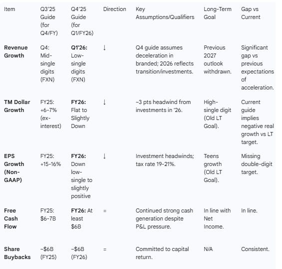 Expect downward revisions for Q1 and FY26 estimates. Revenue growth is guided to low-single digits (anemic for a tech/fintech play), and earnings growth is essentially paused to fund investments.