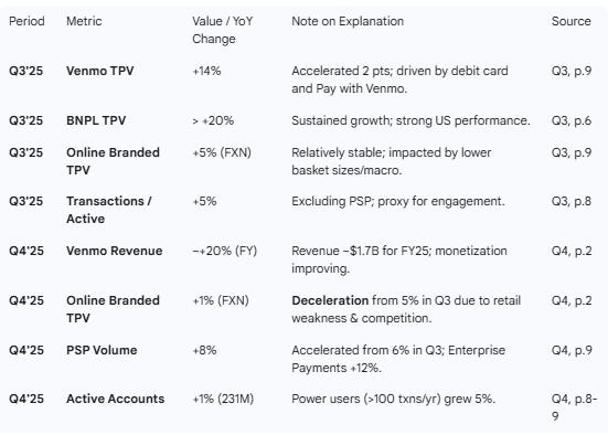 Venmo & PSP Strength: Despite branded weakness, Venmo revenue grew ~20% in 2025, and Enterprise Payments (PSP) returned to double-digit volume growth in Q4.