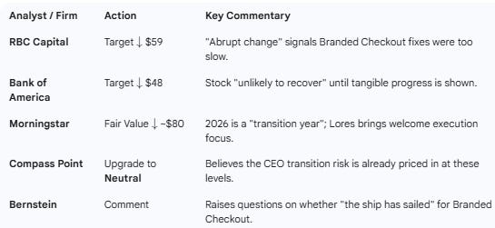 RBC Capital: Slashed its price target from $91 to $59, citing the “abrupt CEO change” as a signal that the pace of change in Branded Checkout was moving too slowly.