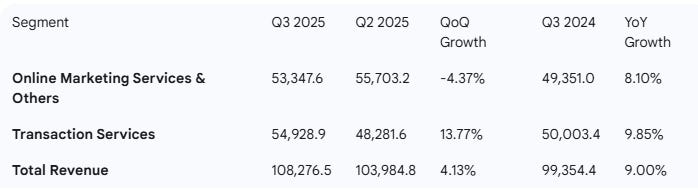 Core Driver: Transaction Services Revenue accelerated to +13.8% QoQ, while the higher-margin Online Marketing Services Revenue declined by -4.4% QoQ, indicating significant pressure on the advertising take rate due to merchant support and competition.