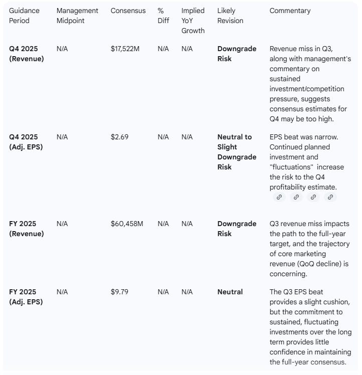 No quantitative guidance was provided. The cautious qualitative outlook, coupled with the miss on revenue and decelerating core marketing revenue, implies high risk to Q4 and FY25 consensus revenue estimates, likely leading to revenue downgrades. EPS may be more stable due to the Q3 beat, but the sustained investment plan makes profitability highly volatile.