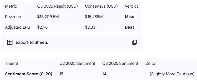 The performance summary below extracts the key financial metrics for Q3 2025 and compares them to the prior quarter (Q2 2025), the same quarter last year (Q3 2024), and the consensus estimates.