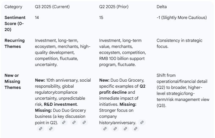 Compared to Q2, management’s tone in Q3 was more philosophical and strategic, rooted in the company’s 10th-anniversary context22. While Q2 was reactive, explaining the immediate financial pain (-21% operating profit YoY) of the investments 23, Q3 was preemptive, institutionalizing the volatility as a fundamental operating principle (”inherently unpredictable,” “linear projection might not be a good way”). The most significant shift is the new and heightened emphasis on the complex, uncertain global regulatory and geopolitical environment, explicitly citing it as a major risk factor impacting both short- and long-term financial performance. This signals a new, major challenge beyond domestic competition and ecosystem investment.