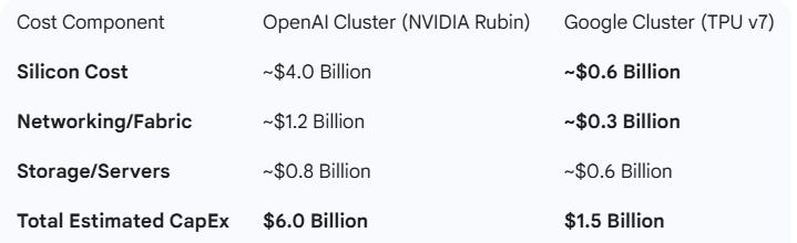 The Vertical Advantage: Google pays the marginal cost of production, estimated at less than $3,000 per chip, whereas an equivalent NVIDIA Rubin module can cost $35,000 to $50,000 on the open market.