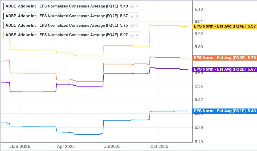 To determine which camp is right, we cannot rely on headline numbers. Adobe reported consistent 11% revenue growth in Q1, Q2, and Q3 of fiscal 2025. On the surface, this looks stable and has been beating guidance. Just look at analyst estimate trends rising - typically you see analysts cutting estimates in a stock experiencing such pressure.